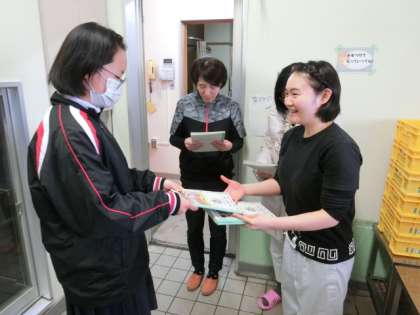 昨日、お伝えしていた「感謝のお手紙」を保健給食委員が代表して、調理員さんにお渡ししました。非常に喜んでくださったそうです(^O^)