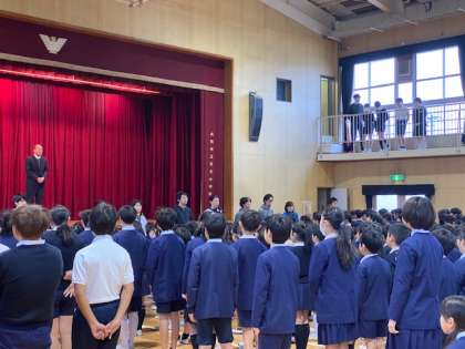 この12月24日を給食記念日としていましたが、この日は冬休みになっている学校が多いので、1か月後の1月24日からが全国学校給食週間になりました。みなさんの給食は、育ち盛りのみなさんに必要なものばかりです。みなさんのために給食に関わっていただいている方たちに感謝し、自分の成長を考えて、毎日給食を味わって食べてほしいと思います。」というお話でした。