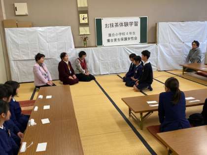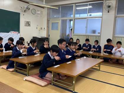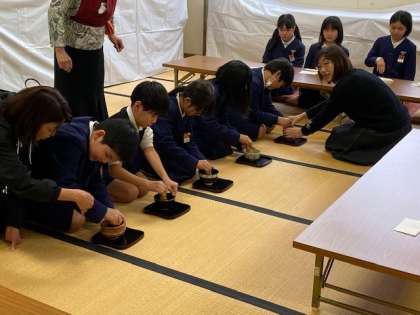 お抹茶の点て方を体験させてもらった児童もいました。茶筅の扱い方を教わりながら、集中して点てていました。