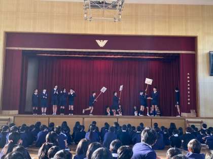 今日の児童集会は、来週の「ルールを守ろう運動」についての啓発の発表でした。