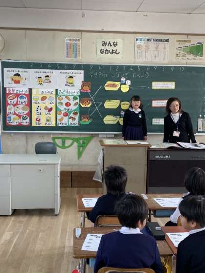 今日は、1年生の栄養指導でした。小山先生から「すききらいしないでたべよう」という内容で教えていただきました。