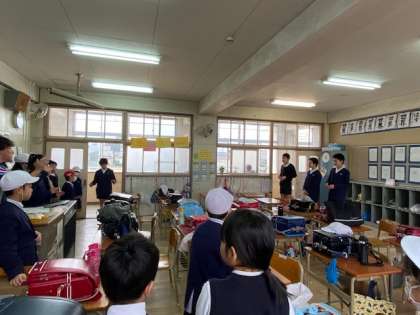 まず、今年度の登校班の6年生に、感謝の気持ちを一人一人が伝えました。「いつもありがとうございました」「中学校にいってもがんばってください」等々…。1年生もしっかりと伝えることができていました。