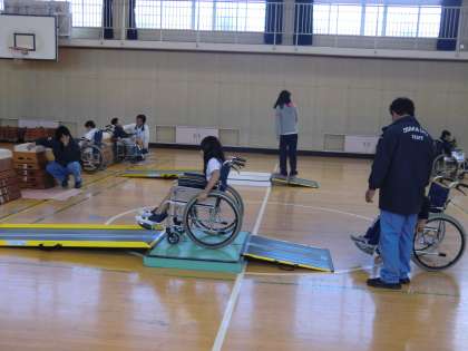 最後は、車いすの「介助体験」をしました。子どもたちは、講堂を出発して運動場や校舎の中に設置された数々の障害を、班の人たちで声をかけあい、協力しながら、講堂までたどり着くことができました。