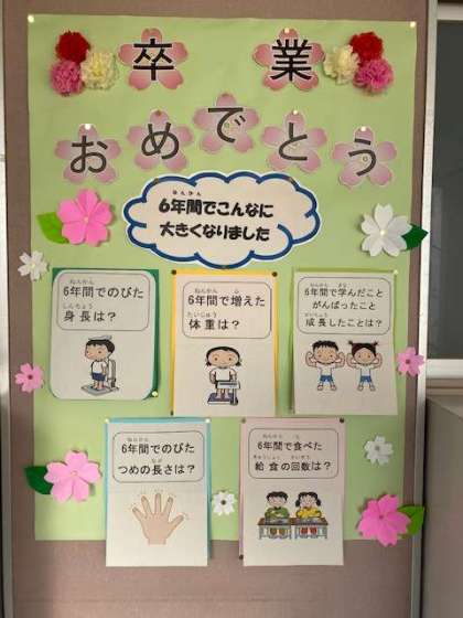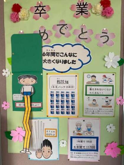 「6年間でこんなに大きくなりました」という題名で「6年間で伸びた身長」「6年間で増えた体重」「6年間で学んだこと、がんばったこと、成長したこと」「6年間で食べた給食の回数」「6年間でのびたつめの長さ」を自分たちで答えを考えて見ることができる掲示物が、保健室前に掲示されています。