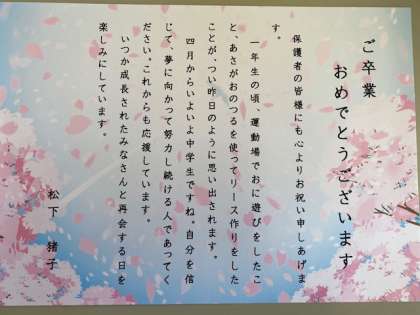 1年生の時の担任の松下先生から祝電が届きました。懐かしいですね。