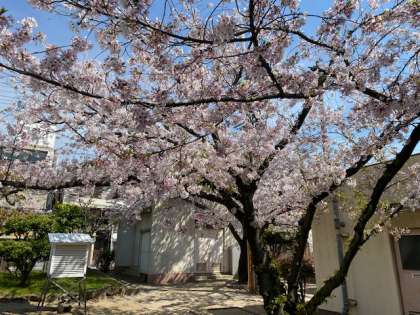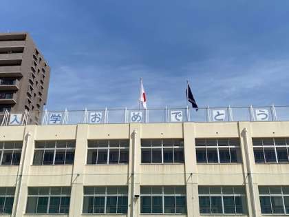 講堂前の桜は満開で、みなさんの入学を喜んで待っていました。玄関前の看板はじめ、会場準備や教室準備もバッチリでした。校舎の上でも「ごにゅうがくおめでとう」と喜びを伝えています。