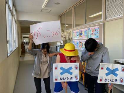「がっこうがあるとき〜」がだいすき。1年生のみんなと、おべんきょうしたり、あそんだり。はやく、みんなと会いたいよ!ルフィーに変身するのが大好きな先生もいるよ(笑)