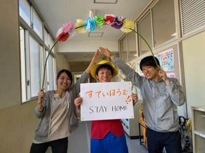 はやく、コロナにうつる人が少なくなって、がっこうがはじまるためにも「STAY HOME!」(いえにいましょう)