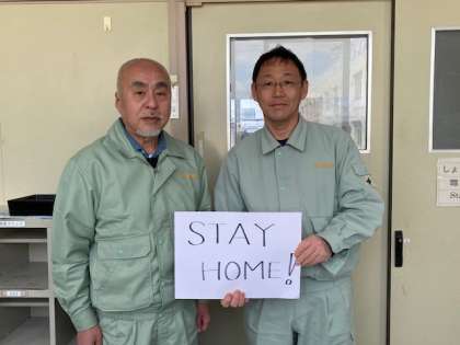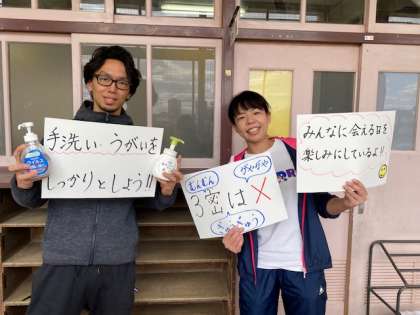 管理作業員さんの鈴木さんと渡部さんからのメッセージは「STAY HOME」です。大阪府の緊急事態宣言に伴い、教職員も在宅勤務を始めました。職員室が、三つの密になるのを避けています。みんなで力を合わせて、感染拡大からオーバーシュートとなってしまい、医療崩壊を起こさないように、自分たちにできることをがんばりましょう。