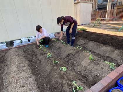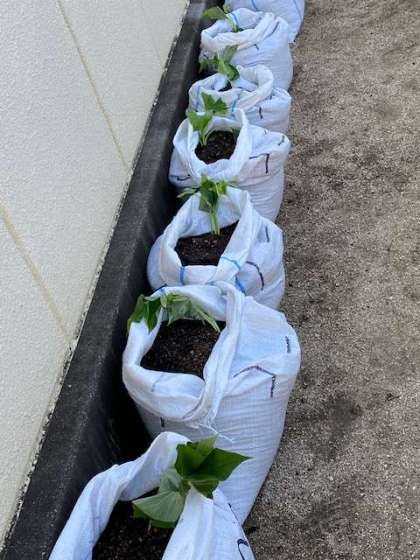 土嚢袋で、1グループ1袋のサツマイモも育てます。秋には、おいもパーティができますね。