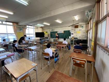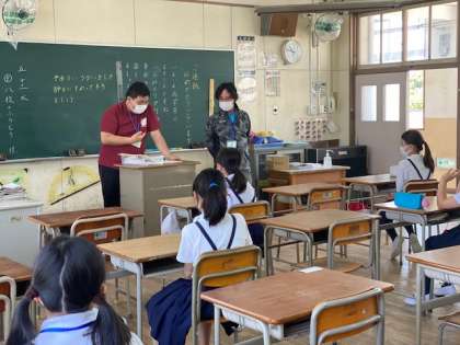 2組の勇元先生から「先生は、いくつに見えますか?」という質問が。とっさのことで、キョトンとしている子どもたちに、入り込みで教室にいた大原先生が「大原先生の方が若いと思う人?」と聞くとチラホラ…。「勇元先生の方が若いと思う人?」こちらもチラホラ…。大原先生的には、自分にたくさん手が上がるともくろんでいたようなのですが(笑) はるかに勇元先生の方が若いのですが、大原先生もそんなに若く見えるわけではないですし…(笑)