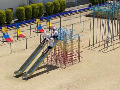休み時間に「運動場へいっといで」と言われたときに行かなかったらしく(笑)「それなら今、運動場を走って帰ってきていいよ」と矢田先生に言ってもらったらしく。運動場を見ると、大きな6年生男子3人が滑り台に(笑) 上から写真を撮りました(^O^)