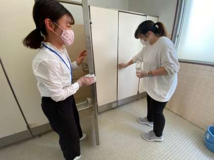 教室のドアや、子どもの机や椅子、窓のカギ、靴箱の上、ロッカーの上など、児童がよく手で触るところの消毒は担任教諭が。トイレのドアノブ、水洗レバーや、水道の蛇口、階段廊下の手すり、遊具などは、白川養護教諭と松坂栄養教諭で手分けをして消毒します。前半と後半の入れ替わりの時と、下校後に実施しています。