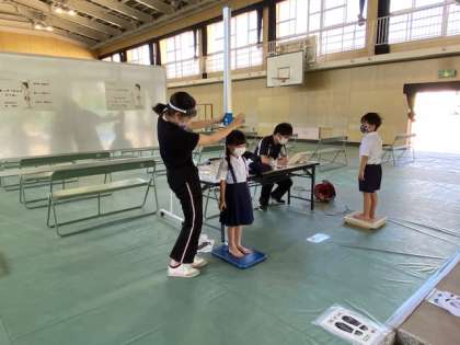 学校の詳細の取り組みは、通常再開前にお知らせします。本日の1年生の発育測定は、旧図書館が教室になるため、講堂で実施しました。視力検査や聴力検査を別日にせずに、広い講堂で、同じ時間帯に実施することで、授業時間の確保にもつなげます。(学校だよりでの日程と少し変更となりました)