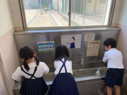 休み時間には顔を洗って、感染予防と共に、熱中症対策にもつなげます。