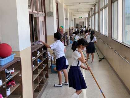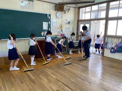 清掃をする姿も、なんだかうれしそうでした。「がんばってね、きれいにしてね」と声をかけると「はーい!」と答えてくれました。1年生は、ほうきの使い方を教えてもらっていました。背丈より高いほうきを扱うのは難しいですね。「ぞうさんの鼻をぶらぶらするように〜。先生の後をついてきて〜」と笠井先生、がんばっていました(笑)
