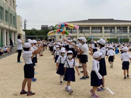 2年生以上の児童も、ソーシャルディスタンスを取りながら、拍手で迎えました。