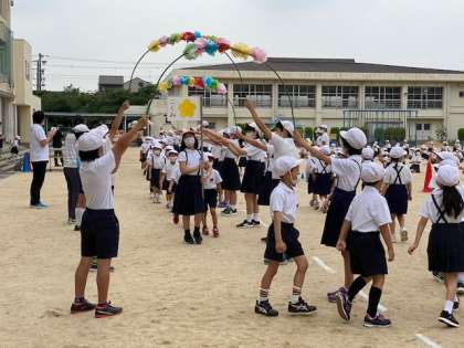 いつもの年なら6年生が1年生の手をつないで入場してくるのですが、コロナの関係で今年はできません。代わりに、花道とトンネルを作りました。トンネルも手はつながずに離れたトンネルです。1年生は、代表委員が持つクラスの旗を先頭に、少し恥ずかしそうに6年のトンネルをくぐっていきました。