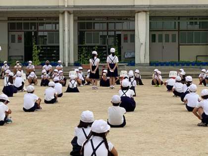 先週は、雨で流れてしまった「にゅうがく おめでとう しゅうかい」ですが、今日は、すずしい過ごしやすい曇り空の下で実施することができました。