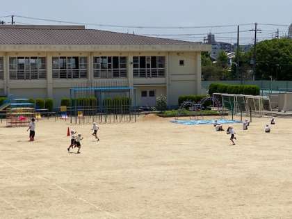 体育の授業も始まりました。2メートルの間隔をとると、マスクを外しての実施が可能です。