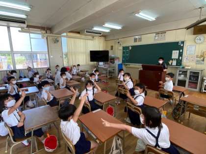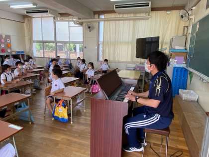 職員室にオルガンの音が聴こえてきました。この曲は‥。学校休業中に、研修で実施した時の、一年生の名前を覚えていく曲です。