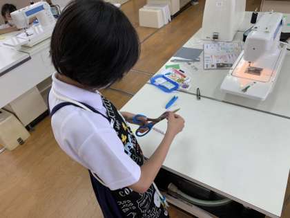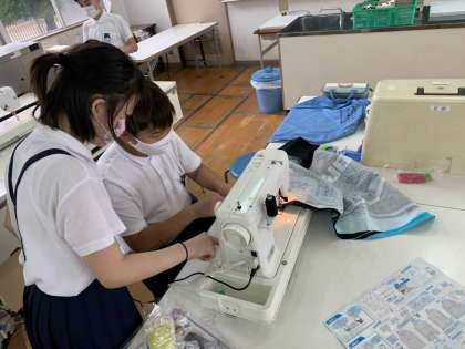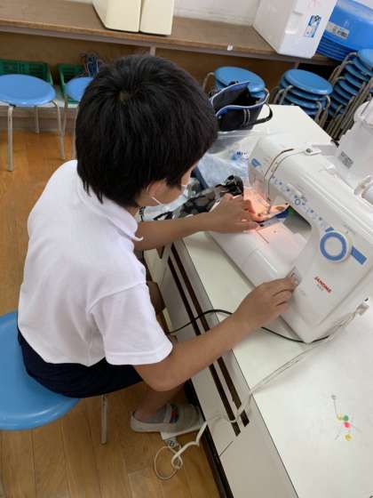 家庭科室の横を通りかかると、ミシンを出してみんなで何やら作っています。中に入るとエプロンを作成していました。昨年度にナップサックを作っているので、ミシンの使い方も上手でした(^O^) 今後も何度かあると思われる調理実習時に使えますね。修学旅行のモクモクファームでも使えるかもしれませんね。