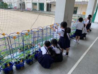 給食室前がアサガオランドになりました。(^O^)/ 次はつぼみができて、いよいよ開花ですね(^O^)