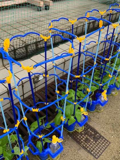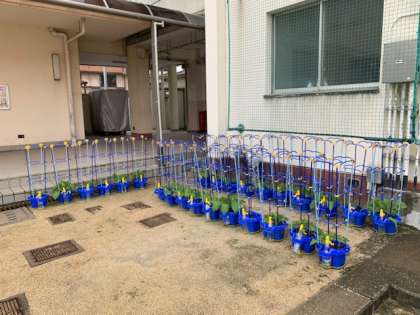 来週まで持ち越すと、廊下にツルがはいそうですので、雨上がりの5時間目に支柱を立てました。そして、隣の鉢との間隔を十分に取らないと、ツルとツルが絡まって大変なことになってしまいます。