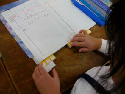 子どもたちは前時の学習をもとに、自分たちでめあてを立て、ブロック・図・言葉、「10といくつ」にわけて考えるなど、さまざまな手段で計算方法をみつけていました。