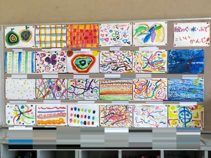1年生は、パスの使い方を学びました。ぐるぐる塗りで「キャンディボックス」、線描きで「きれいなのぼり棒」。廊下の掲示板にも貼り出されています。