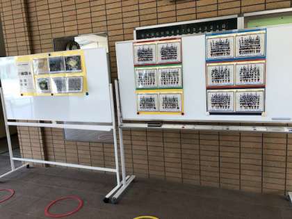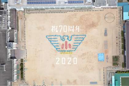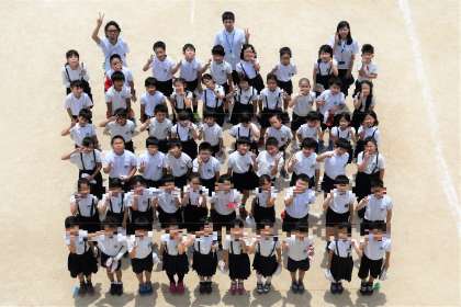 先日、創立70周年を記念して航空写真、児童の記念集合写真を撮影しました。子どもたちが校章のデザインを人文字で描き、セスナ機を使って撮影しました。その後、子どもたち全員や学年ごとの集合写真も撮影しました。写真見本は、玄関付近にて掲示しておりますので、ご自由にご覧ください。