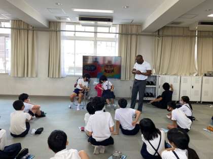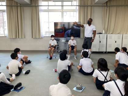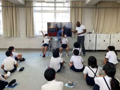 C-Netは今年もアレン先生です(^O^) うれしいですね。6年生の英語の授業の様子です。回答者の後ろのテレビに、答えの画像が映し出されています。