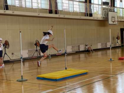 6年生の体育単元は「高跳び」です。十分なストレッチと準備体操をした後に、それぞれのチャレンジする場で試技を繰り返します。