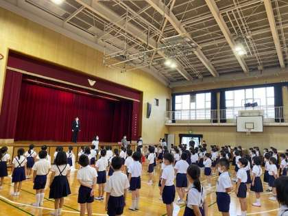今日の朝会は、1年生から3年生は担任が引率して、4年生以上は放送を聞いた後に講堂に集合する、という形をとりました。階段の下や講堂前で「おしゃべり禁止」のプラカードで注意喚起もしましたので、先週同様、ソーシャルディスタンスを取って、静かに講堂に集合することができました。