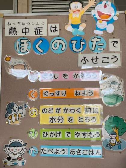 保健室前の掲示物が変わりました。梅雨が明けたら、本格的に熱中症対策が必要になります。