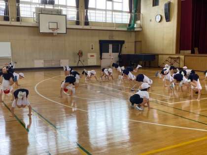1組は講堂で、カエルさんになってお尻のところで、足を数回打つ「カエルの足打ち」。「逆さ感覚」や「腕支持感覚」を養う感覚運動です。この動きが、学年が進んだらマット運動や跳び箱運動にもつながっていきます。