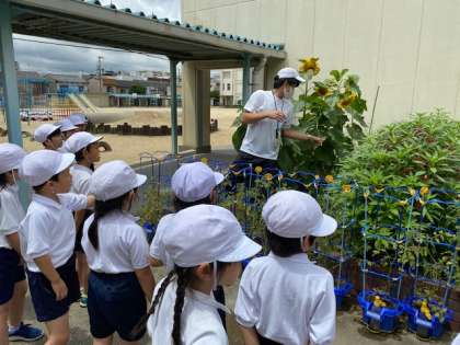 2組は、体育の前に学習園の様子を観察しました。津村先生の顔より大きいヒマワリの花や、ツルがしっかり巻き付いたフウセンカズラ、花がいっぱい咲いているホウセンカの様子を見ました。