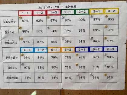 7月6日(月)〜10日(金)の「あいさつ週間」の結果がでました。「元気な声で」「自分から」「地域の方に」の3つの観点で自己評価しました。