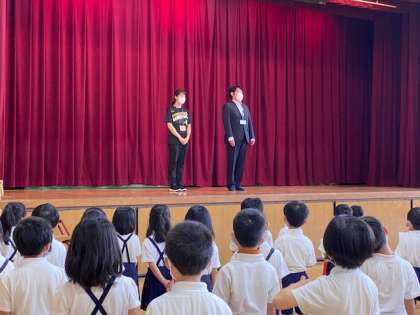 校長先生のお話は「熱中症予防強化月間」についてでした。熱中症は「こまめな水分補給」「暑さに負けない体力作り、そのための早寝早起き朝ごはん」「帽子をかぶるなど、直射日光を避ける」これらのことを常に意識して、熱中症にかからないよう気をつけましょう、というお話でした。