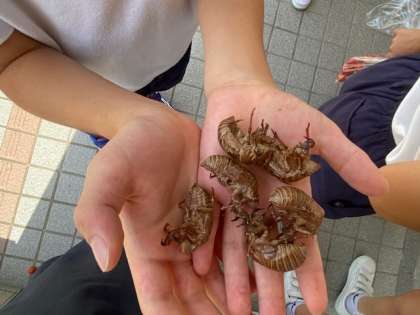 「シャンシャンシャンシャン…」鳴いている声から成虫を見つけ、久野先生に補注網で取ってもらって、大喜びでした(^O^)
