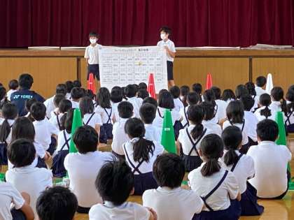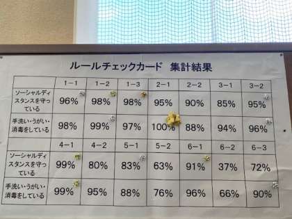 生活・集会委員会から「ルールを守ろう週間」の結果発表がありました。コロナ対策として「ソーシャルディスタンスを守っている」「手洗い・うがい・消毒をしている」についての自己評価です。しっかりと守っている、気を付けている、と意識している児童が多い結果となりました。コロナの感染が広がってきています。感染経路のわからない人も多いです。