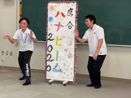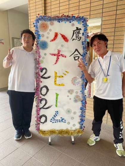 大原先生が「みなさん、昨日のホームページを見てくれたかな? ハナビームが近づいてきたね。先生たちで『看板』を作ったから、今から発表します」と、前振り。