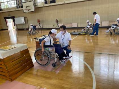 乗るときは、ブレーキがかかっているか確認してから座り、フットプレートに足を乗せ、ブレーキを外します。そしてハンドリムを使って前後左右に移動します。降りる時は、ブレーキをかけてから、フットプレートを上げ、車いすから降ります。実際に進むコースを歩いた後に、一人ずつ車いすに乗ってみました。