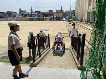 次の時間は、車いすに乗っている人を介助する体験と、車いすに乗って介助される体験をしました。車いすに乗ってみると、坂道や狭い道、曲がり角などが怖いものです。決して楽で楽しいものではありません。1階の廊下から運動場、スロープなどを通ることで、実体験することができました。