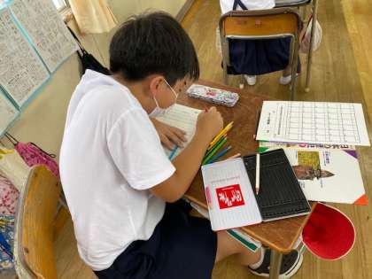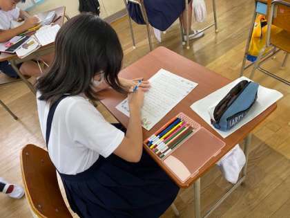 児童会一同から、地域のお年寄りの方々への「敬老の日」にお渡しするお手紙を作成しています。