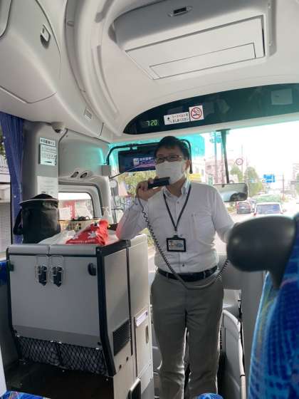 バスの中では、それぞれ運転手さんの紹介、2号車は添乗員さんの松嶋さん、1号車は、カメラマンの中島さんの紹介があり、全員で『よろしくお願いします!』とご挨拶しました。