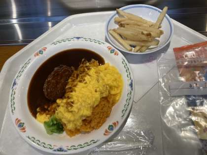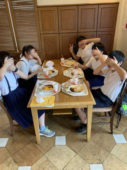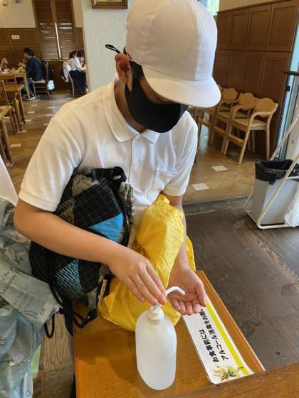 早々と先に食事から始めたグループもあります(笑)食事前に、ちゃんと消毒をしています。美味しそうですね。ここにデザートとドリンクもつきます。