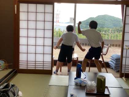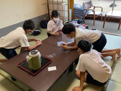 部屋に戻ると、クラスごとの入浴タイムです。昨年度の林間学習で、『10分前行動、5分前集合』を徹底的に躾けられているので、今年はスムーズですね。同じ部屋に一組二組三組がいるので、お風呂に行く人、部屋で過ごしながら順番を待っている人といろいろです。