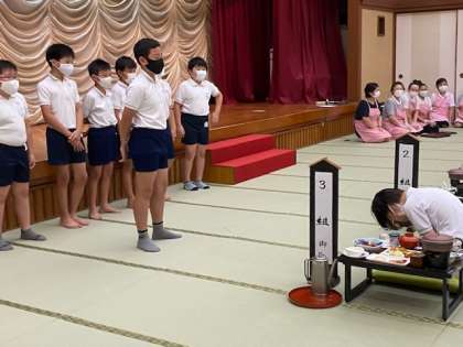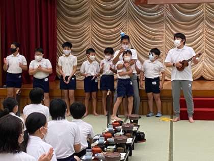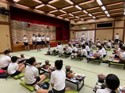 パルケで思い存分遊んで、お風呂で汗も流してスッキリ。お腹もいい具合にペコペコです。大広間に入ると、美味しそうな夕食が整然と並べられています。クラスごとの活動班で座席につきました。永井先生から『いただきます!』と言うまでマスクは外しませんよ、と連絡がありました。