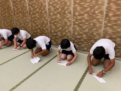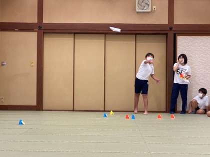 文句を言わない、勝ち負けにこだわらない、盛り上がる、協力するなどの確認をしてから、始まりました。活動班12チームと先生チーム、計13チームが、6つのゲーム、『空を飛ぶ』『背中に目』『ころころ』『集中力』『文句を言わない』『団結力』で、競い合います。最初は『空を飛ぶ』ゲーム。出場者は、白上質紙を一枚もらい、最も飛距離を稼ぎそうな飛行物を作成します。普通は、紙飛行機を思い浮かべると思うのですが、『現実にないものでもいいのですか?』という質問が。ん?現実にない飛行物?UFO?どうやって折るの?と、教師チームざわざわ(笑)『紙飛行機を作りましょう!』と矢田先生。30秒の作成時間の後、順番に飛ばしていきました。Uターンするのやら、急降下で落下するのやら。歓声が上がりました。
